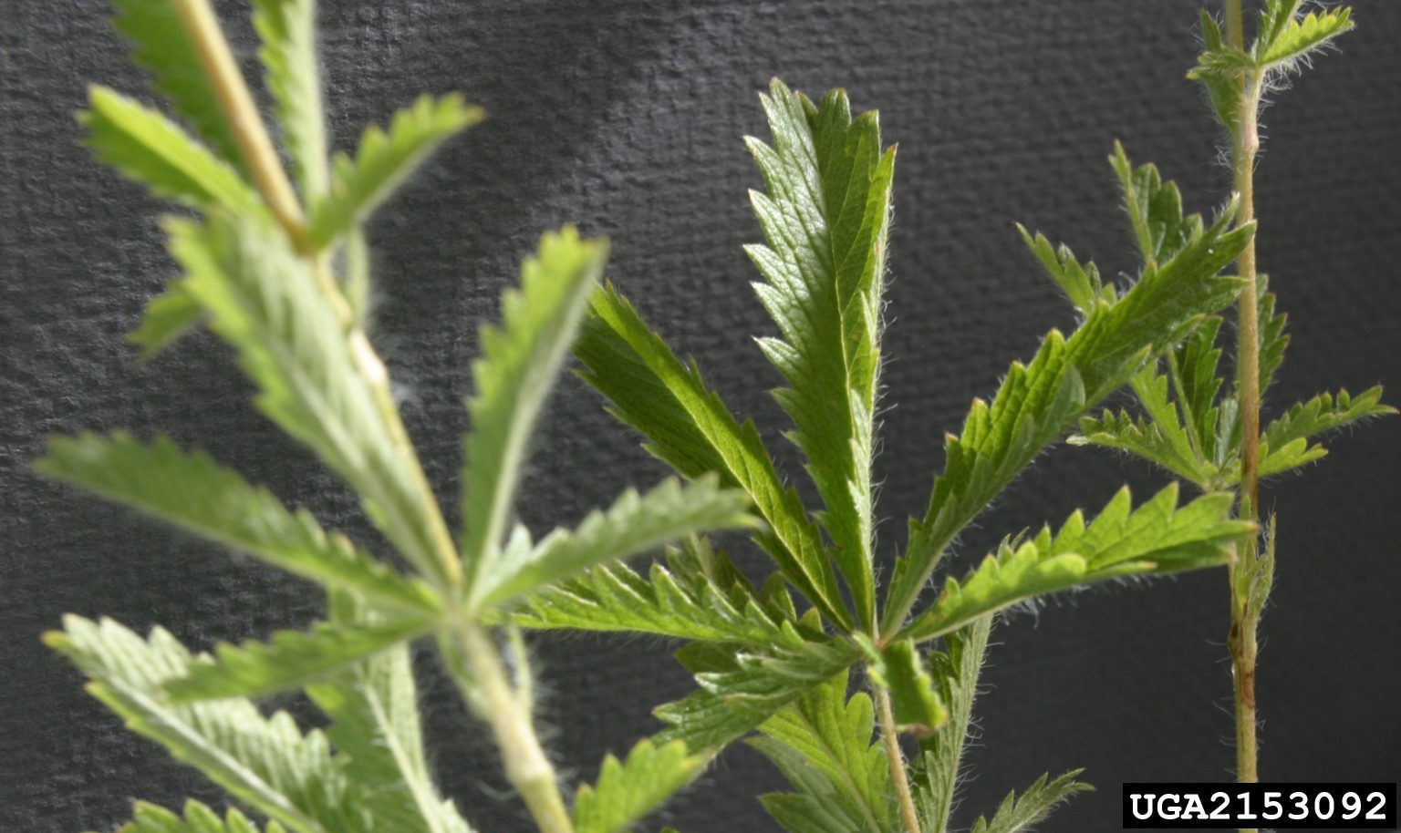 Perennial; one to several stems per plant. Numerous leaves on the stems, 5-7 leaflets with toothed edges. Stems and leaves are covered with stiff hairs. Pale yellow flowers with 5 heart shaped petals. The native look-alike, slender cinguefoil (Potentilla gracillis), has white woolly hair on the undersurface of the leaves; the invasive plant does not have the woolly hairs.